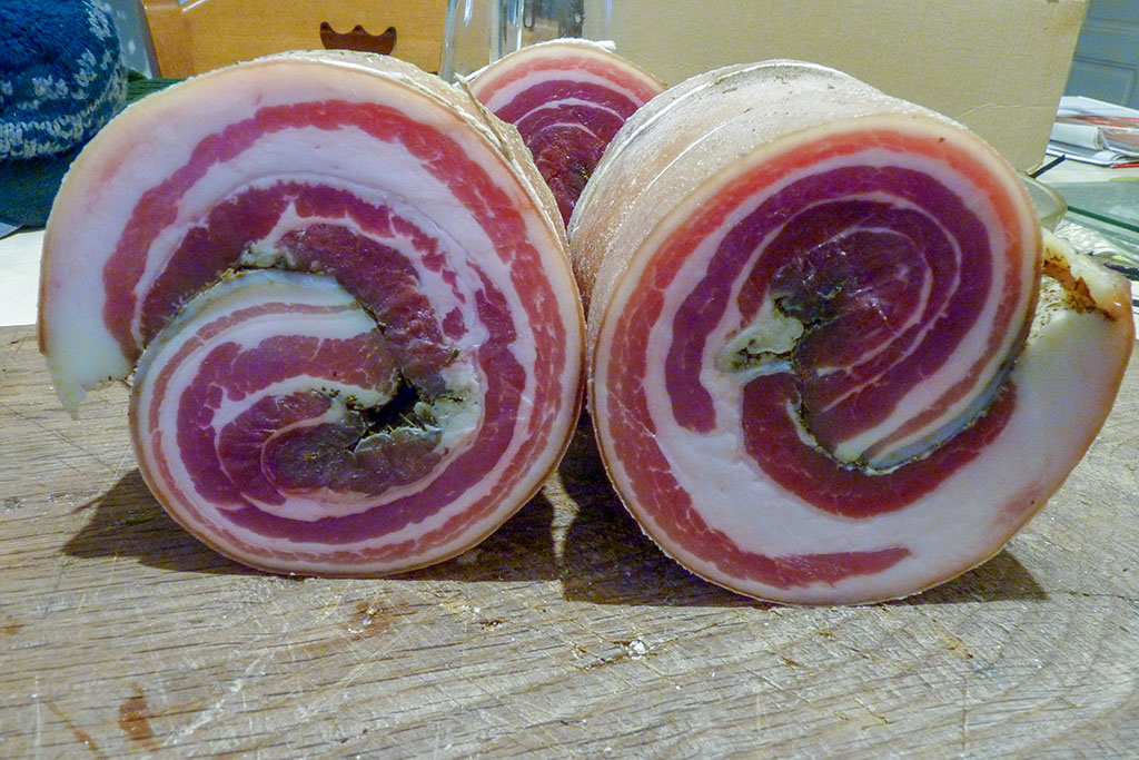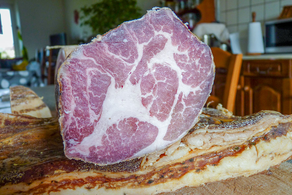 Et toute la salaison : saucissons secs, saucissons à l’ail, lard, pancetta, coppa.